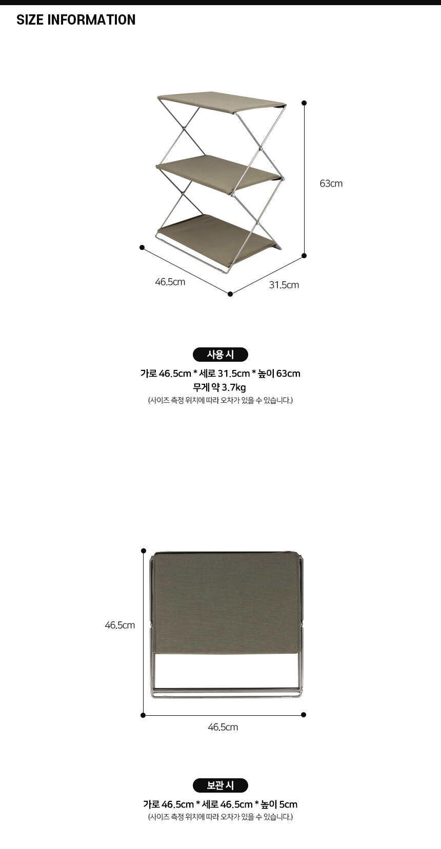사용 시 - 가로 46.5cm * 세로 31.5cm * 높이 63cm